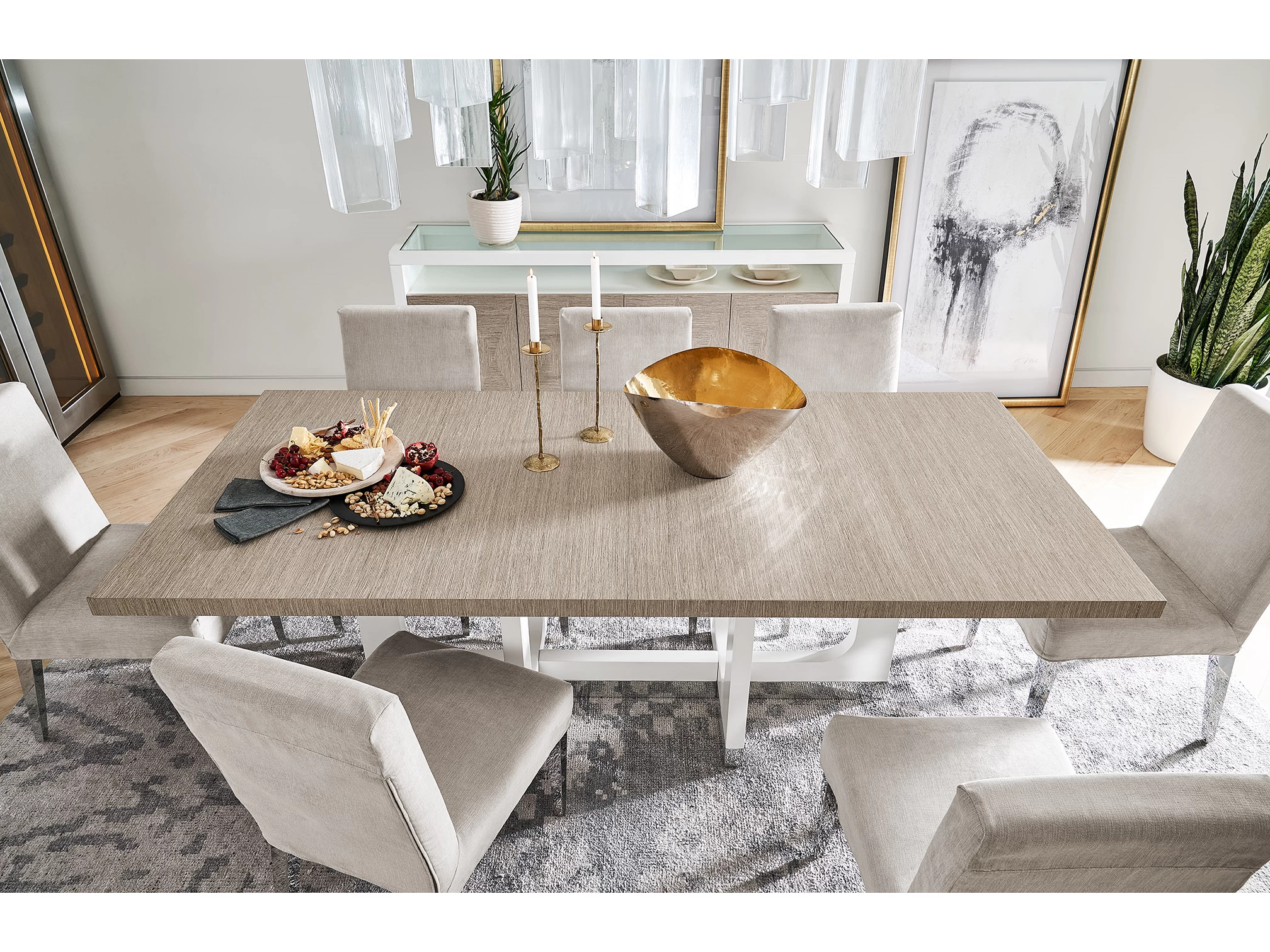 This Dining Table is a breath of fresh air, pairing a warm-hued tabletop with a two-toned base in white with a silver bottom; bringing life and a lighthearted energy into dining spaces.