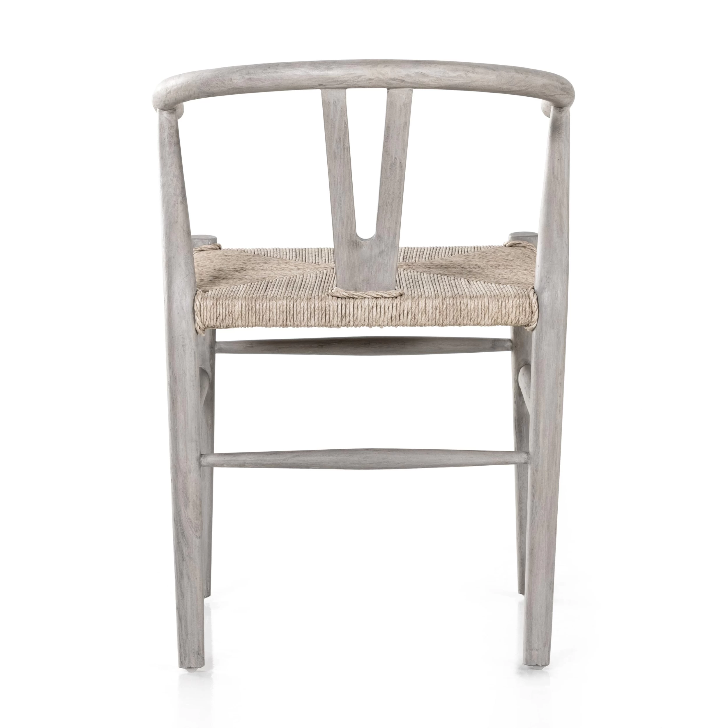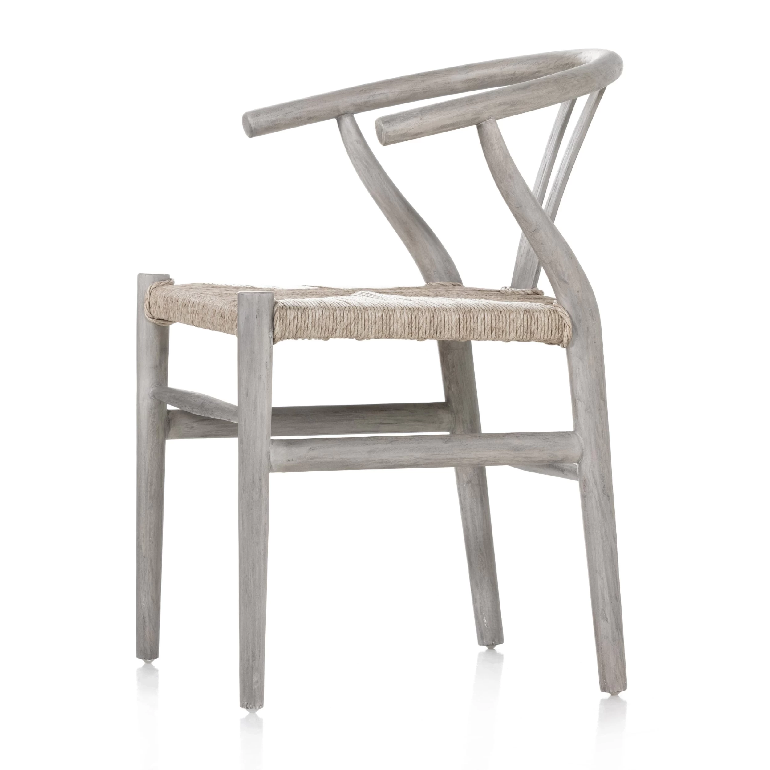 Modern curves redefine classic wishbone seating. Vintage white all-weather wicker is woven for a dose of fresh texture upon a neutral palette. Cover or store indoors during inclement weather and when not in use.
