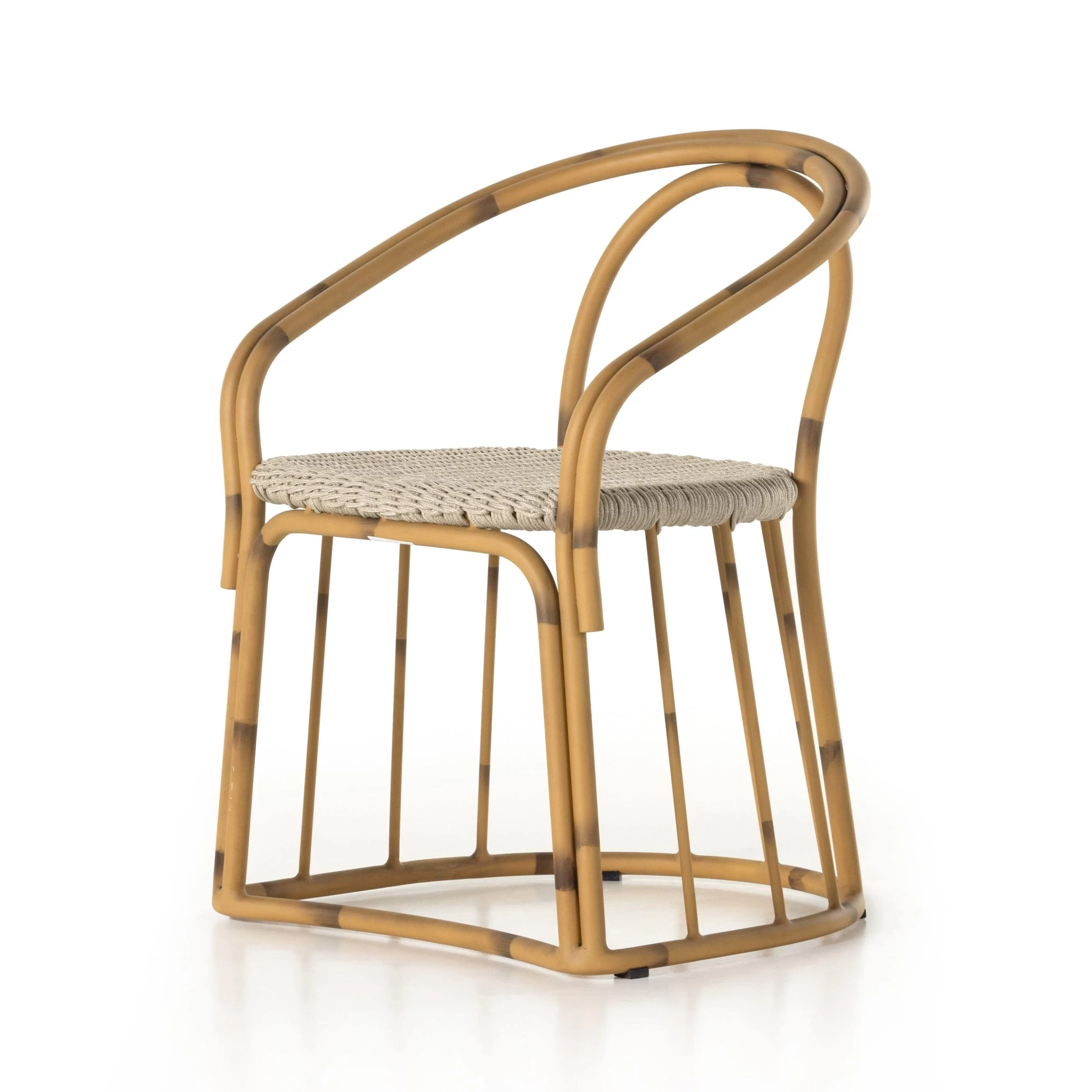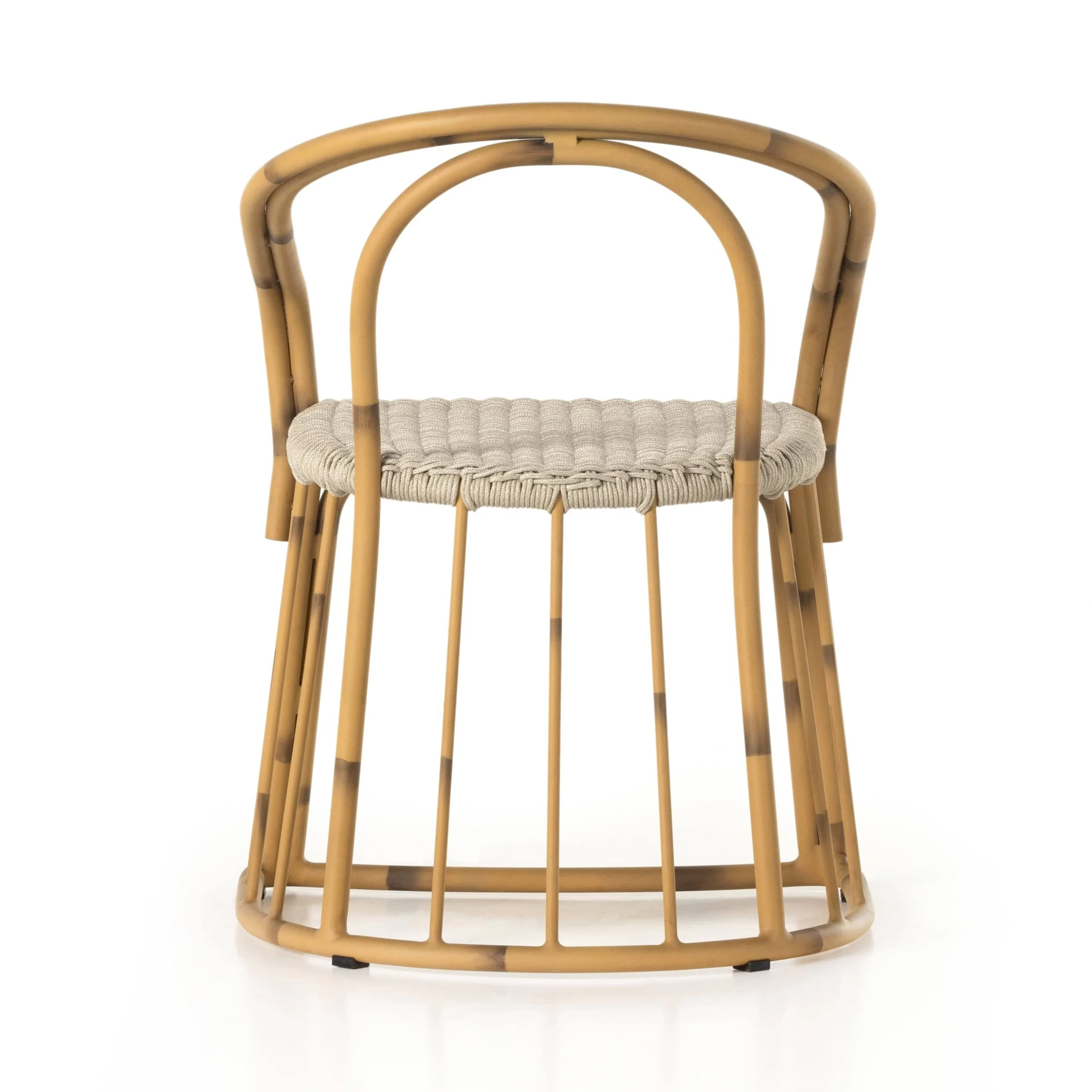 Seventies-inspired with a touch of Parisienne cafe style. Frame is crafted from durable powder-coated aluminum that is then handpainted for the look of rattan. Woven rope seat brings a found look to this outdoor dining chair. Cover or store indoors during inclement weather and when not in use.