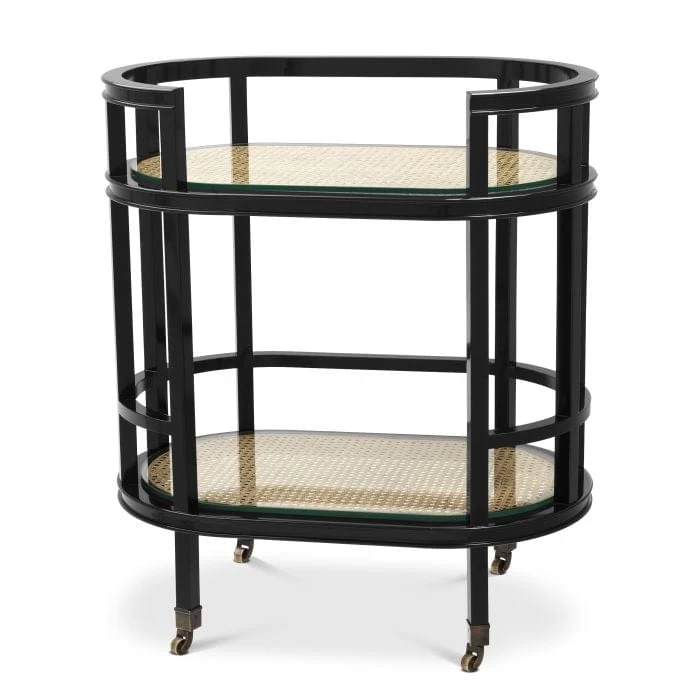 The oblong Bahamas Trolley will add a touch of elegance to any living room or veranda. It is made with pine wood, clear glass, natural cane-webbing mesh, antique bronze casters, and a beautiful black finish.