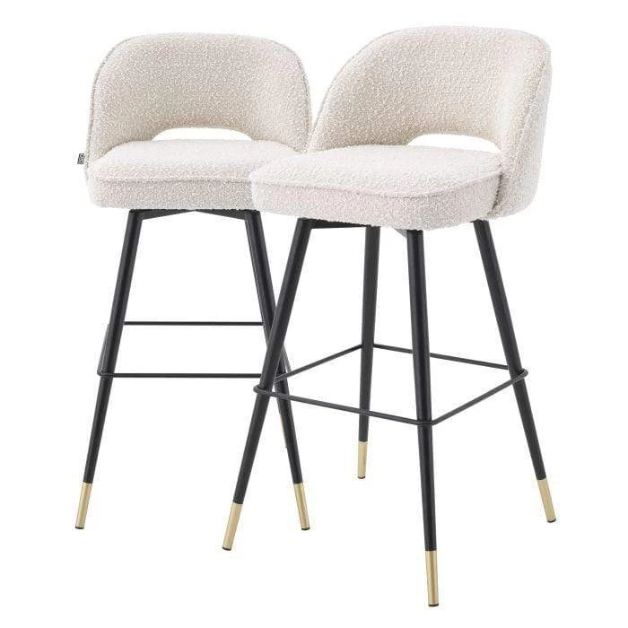 Create a wow-worthy interior with the Cliff Bar Stool in Bouclé cream, that comes in a set of 2. Featuring black tapered legs with gold caps, the solid frame holds an armless back that is open at the bottom before the seat. Its stylish silhouette is accentuated with black faux leather piping.