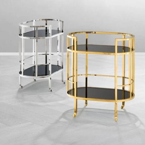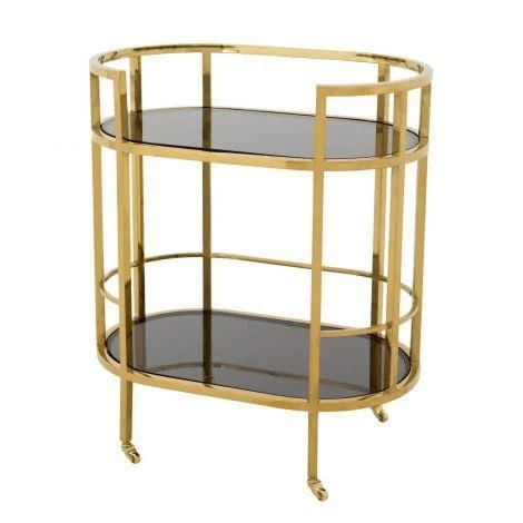 The Townhouse Trolley is perfect for pouring and storing your favorite drinks. Four decorative casters provide this fabulous side table with the striking vintage look of a traditional bar cart used to serve cocktails. It is designed with an elegant curved gold-finished frame with two dark smoked glass shelves.