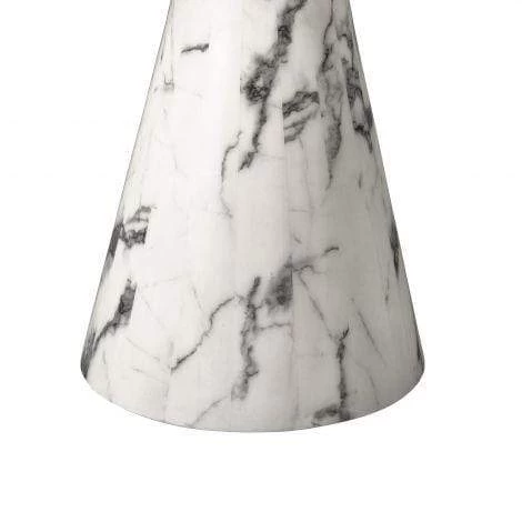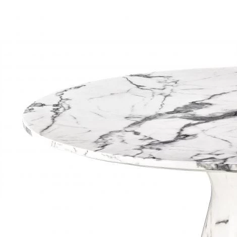 The remarkable Turner Dining Table is crafted from white faux marble and features characteristic black swirls and veins.