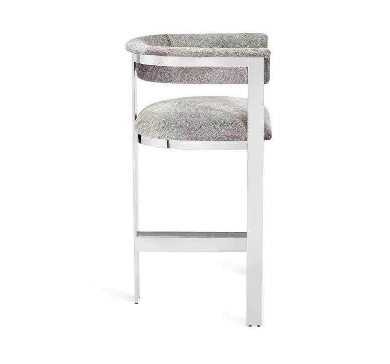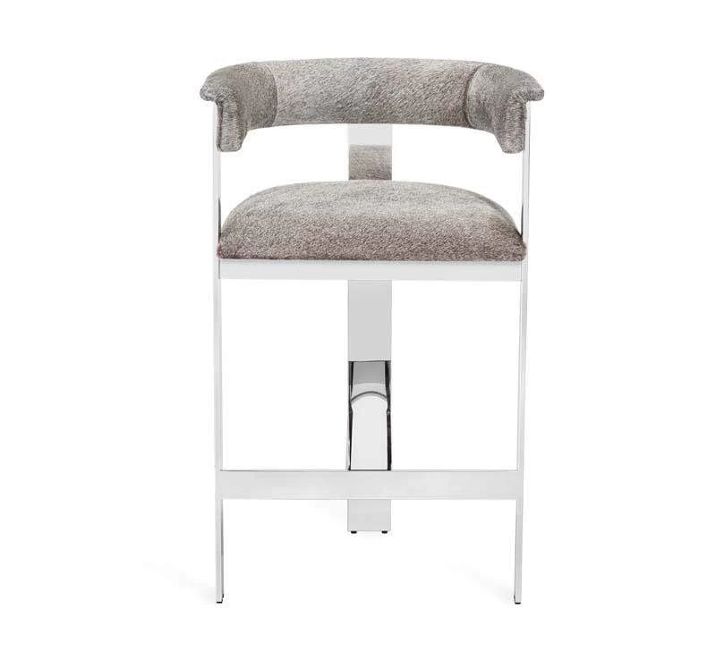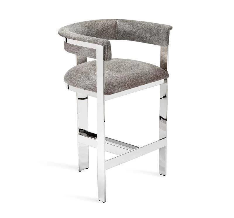 Boasting an art moderne influence, the Darcy Counter Stool features a natural grey hide seat and a streamlined stainless steel frame in an polished nickel finish.