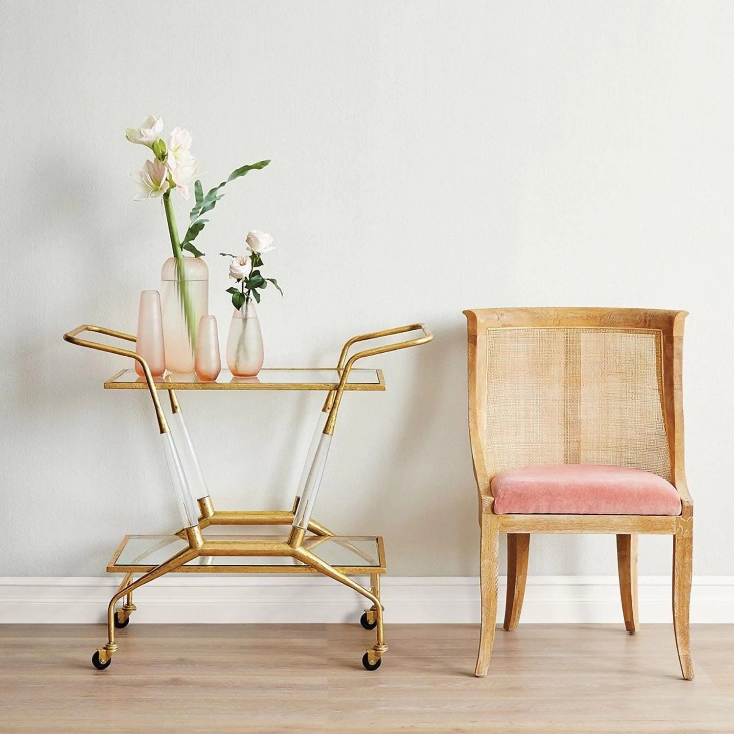 No cosmopolitan abode is complete without a bar cart, and our Mallory is here to meet your needs. Its striking silhouette and unique application of mixed materials is sure to spark a conversation even before you pour your guests their drinks. All clean lines and geometric angles, the Mallory Bar Cart is inspired by 1950s French Modern design, brought to life with a framework of gold-leafed iron accented by four acrylic pillars. Two clear glass trays sit suspended on their gilded frames, creating the illusion that they’re floating on air. Sat atop four wheels, the Mallory can be easily wheeled in for cocktail parties and gatherings or stand as a glamorous fixture in a den or dining room.