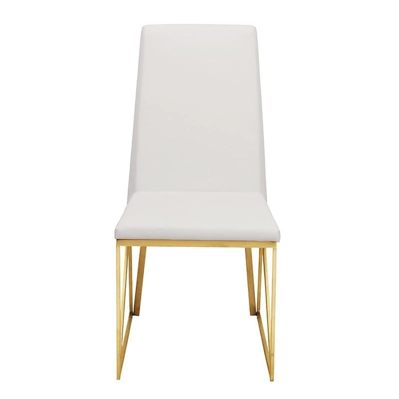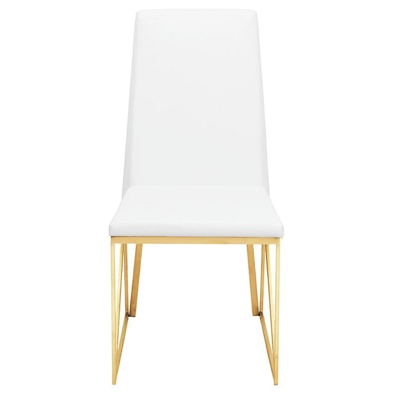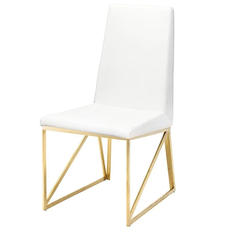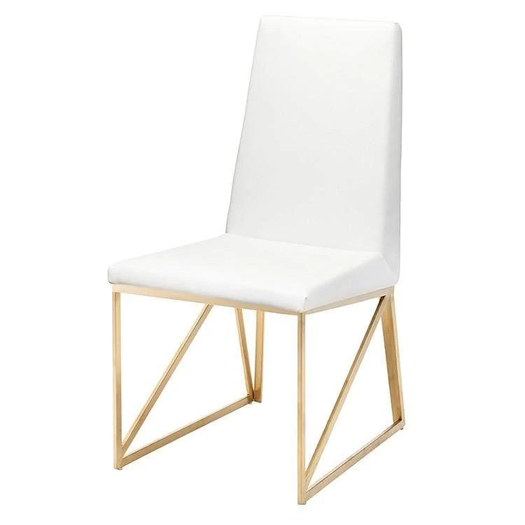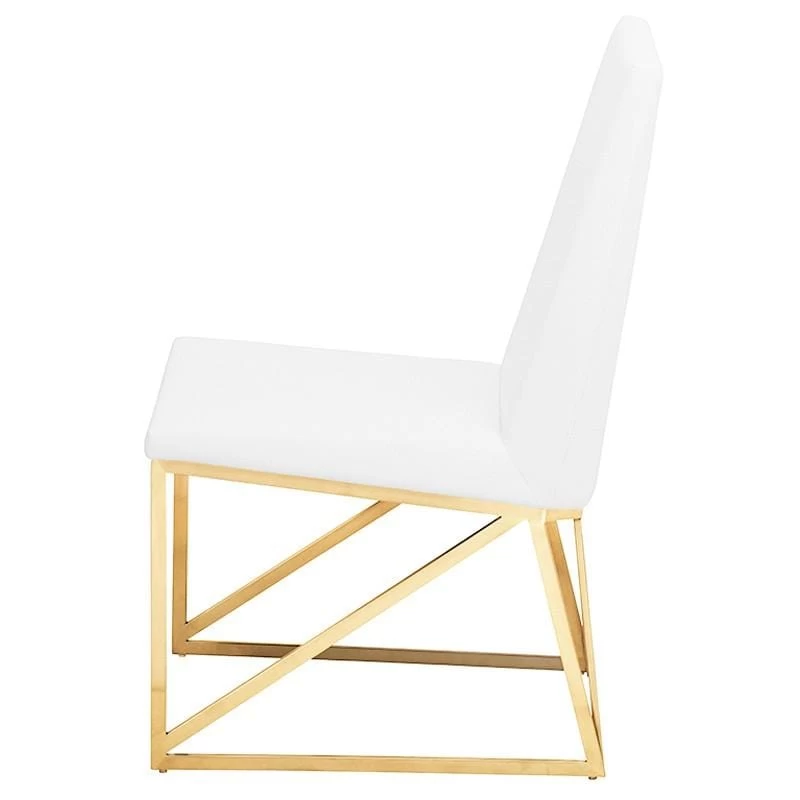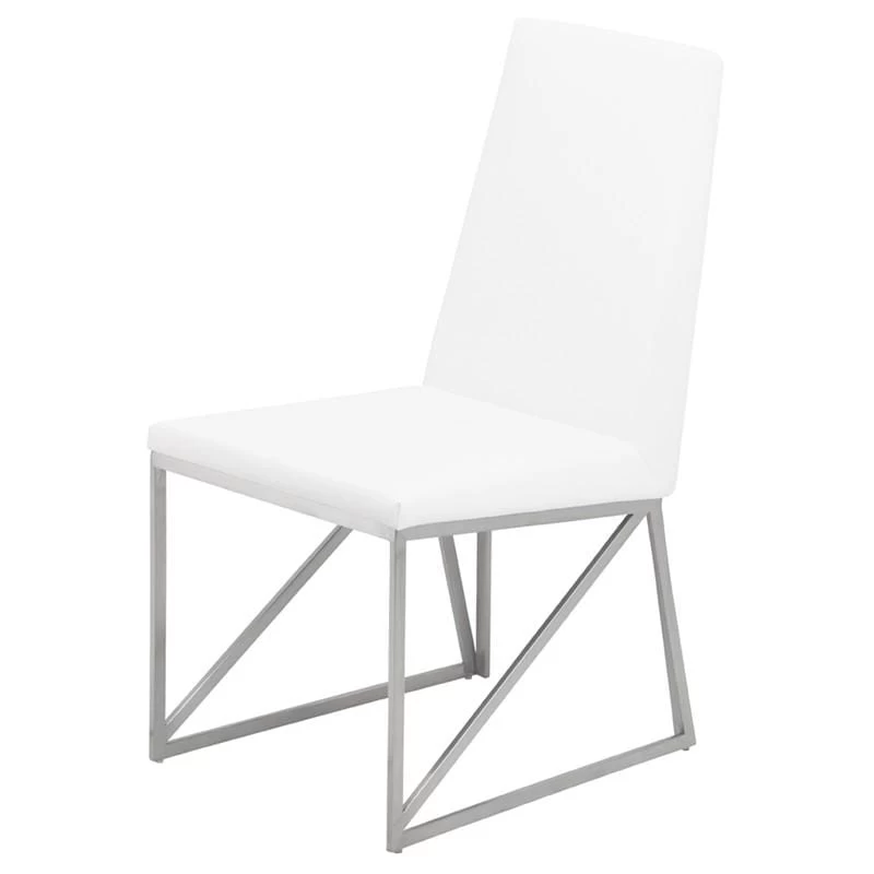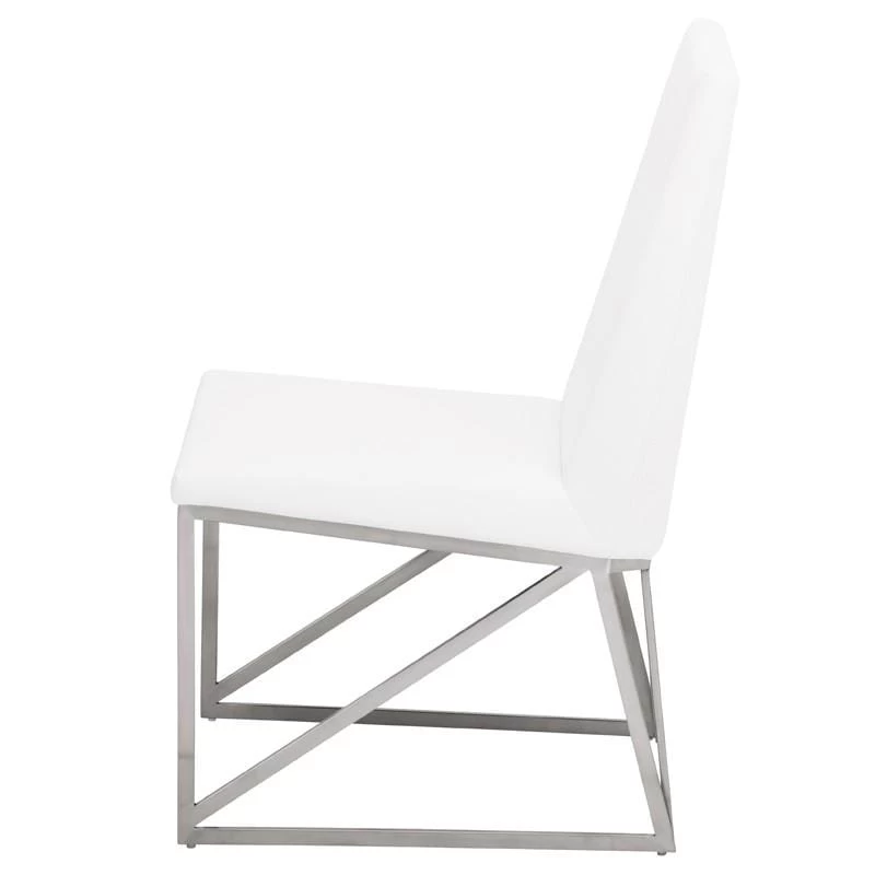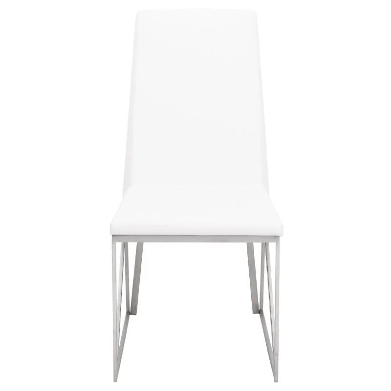 The Caprice dining chair features crisp modern lines and easy comfort. The light elegant brushed stainless steel frame incorporates a unique linear triangle design providing added structural support. A well-padded seamless white naughyde seat and seat back is tailored with a streamlined simplicity presenting an air of contemporary sophistication.