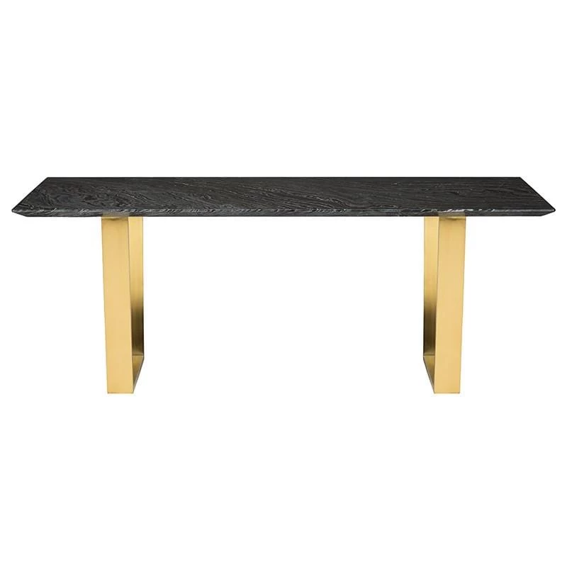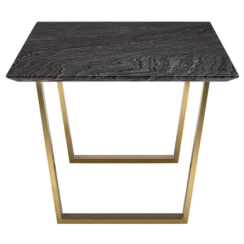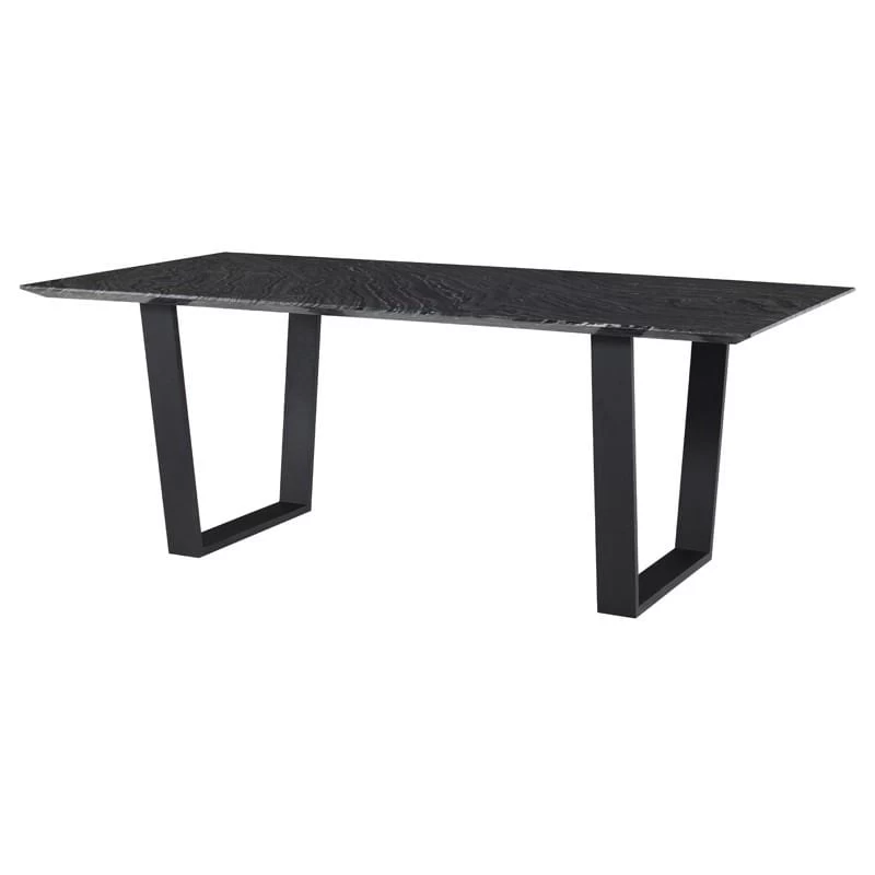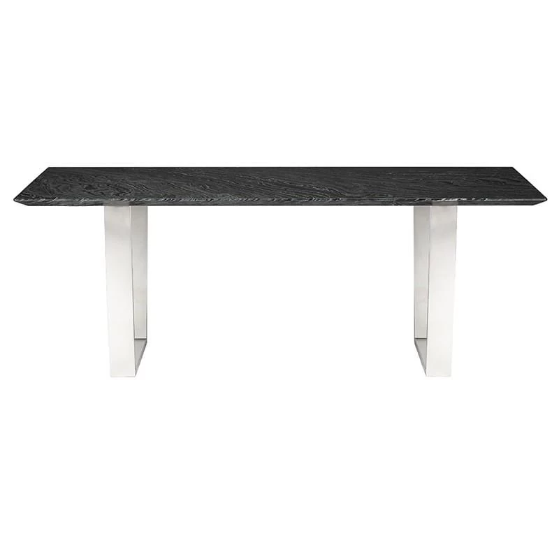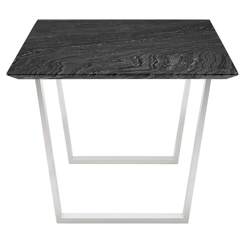 The Catrine dining table is a striking example of elegant contemporary design. Bold modern lines define the Catrine, pairing a cool textured marble table top with sculpturally minimalist matte black flattened steel black water nein legs presenting a sophisticated urban aesthetic.