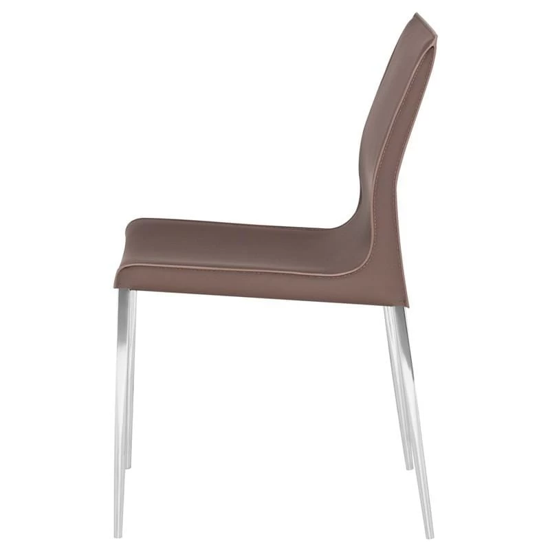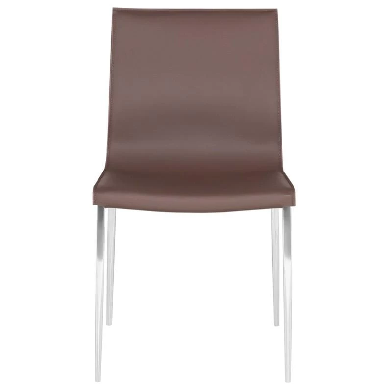 The Colter dining chair is understated Italian contemporary design at its best. A beautifully crafted leather tone-on-tone stitch upholstery seat is paired with a high polished stainless steel frame for a chic, refined look appropriate for any elegant space.