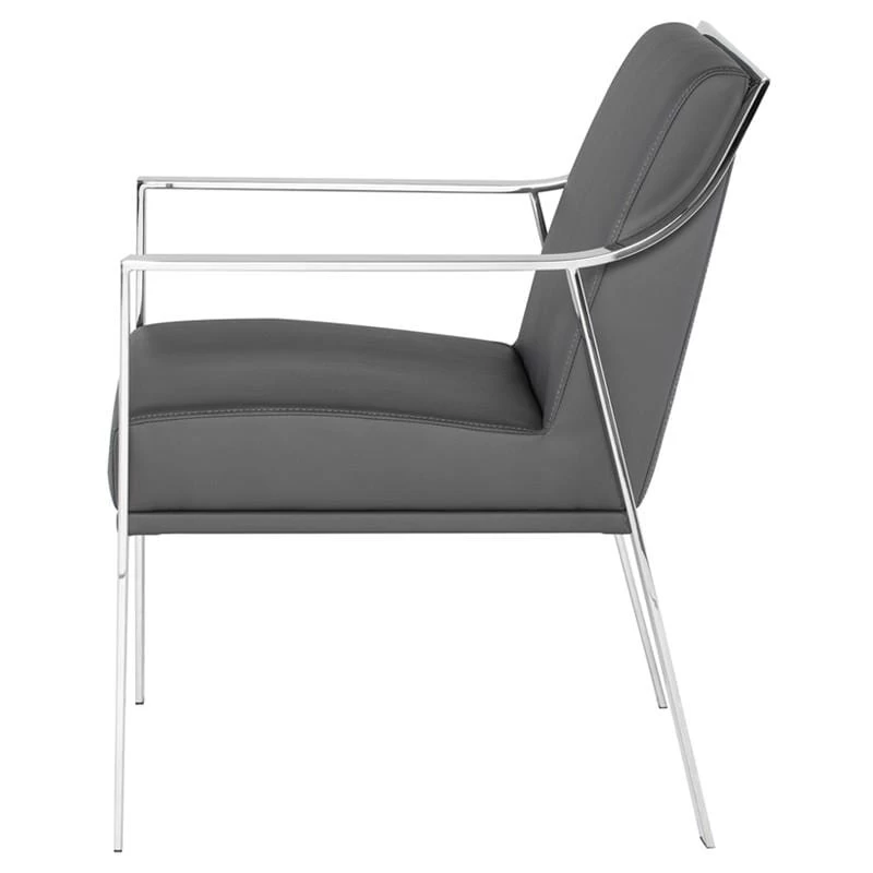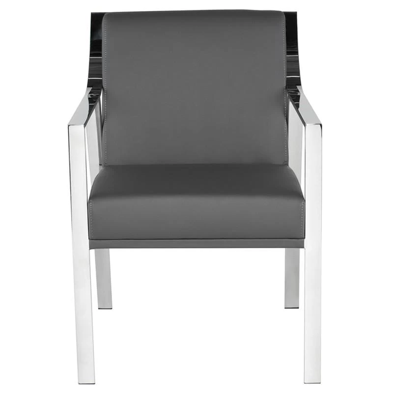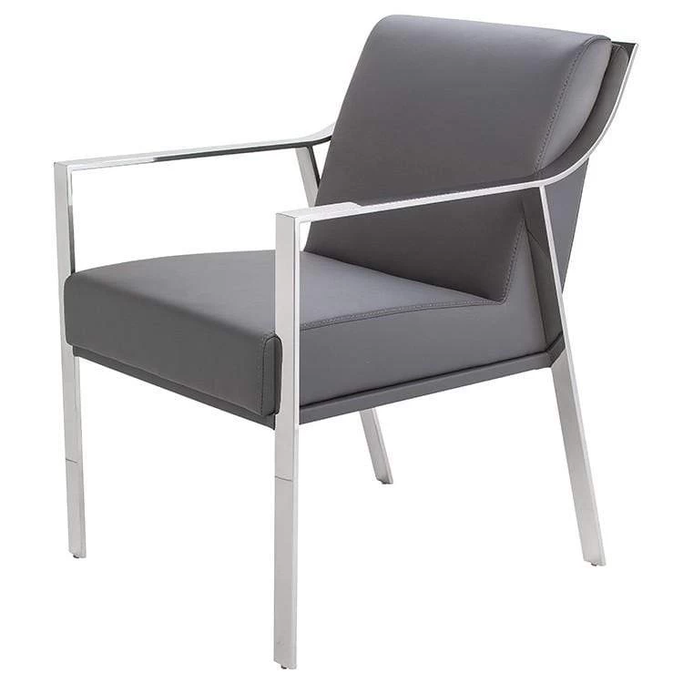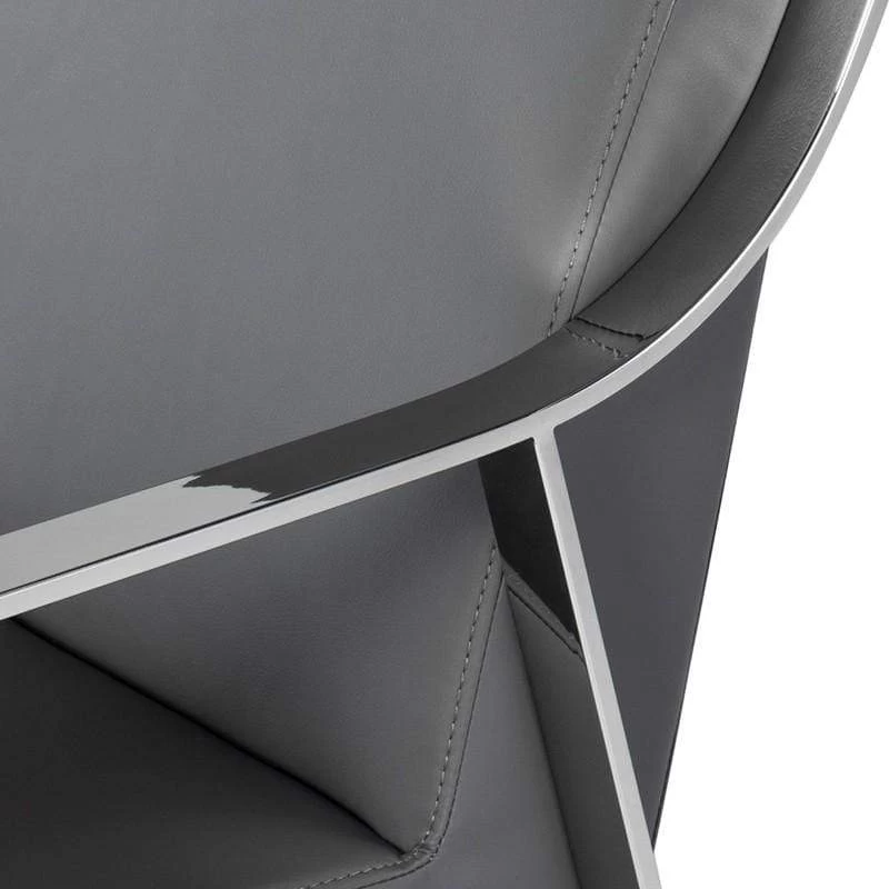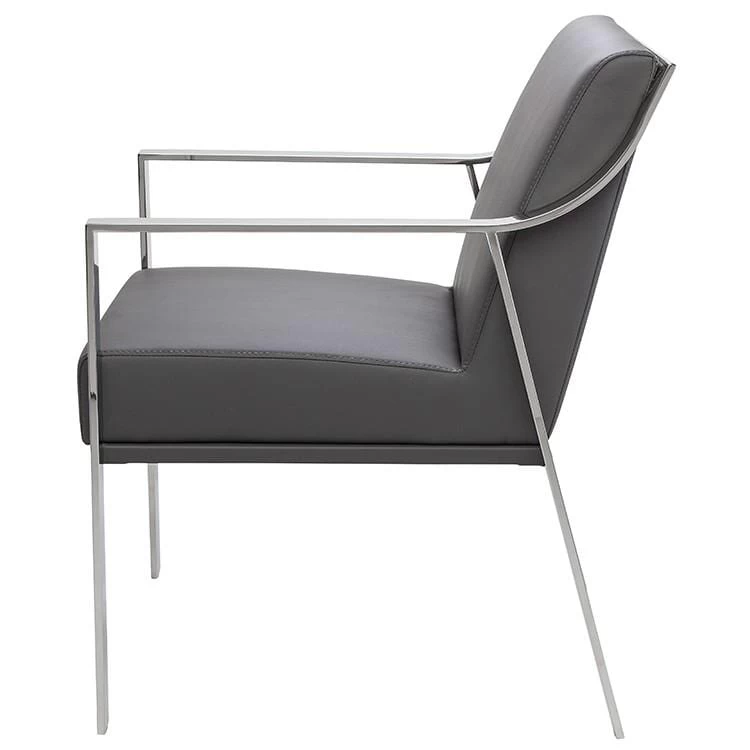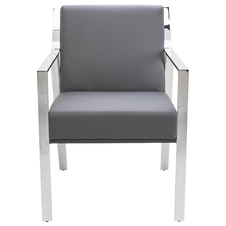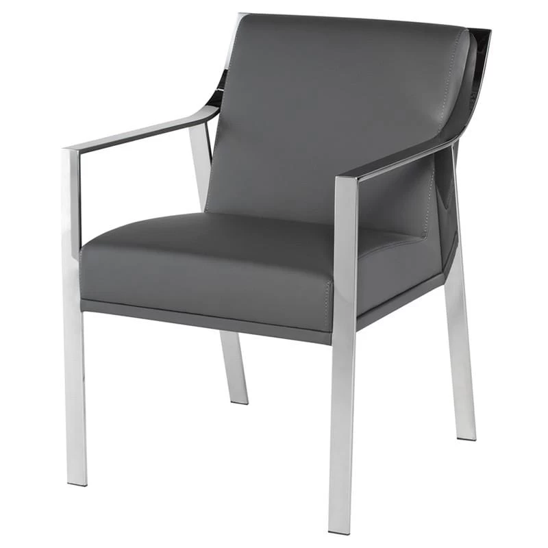 The smart, elegant, Valentine dining chair is equally suited at the dining table or as an occasional chair. Gracious and refined, the Valentine features a brilliant flattened stainless steel frame with subtly curved arms accenting tailored upholstery densely fitted for exceptional comfort with a contemporary flair. The Valentine dining chair is available in polished stainless steel or brushed gold stainless steel with white, black or grey naugahyde upholstery.