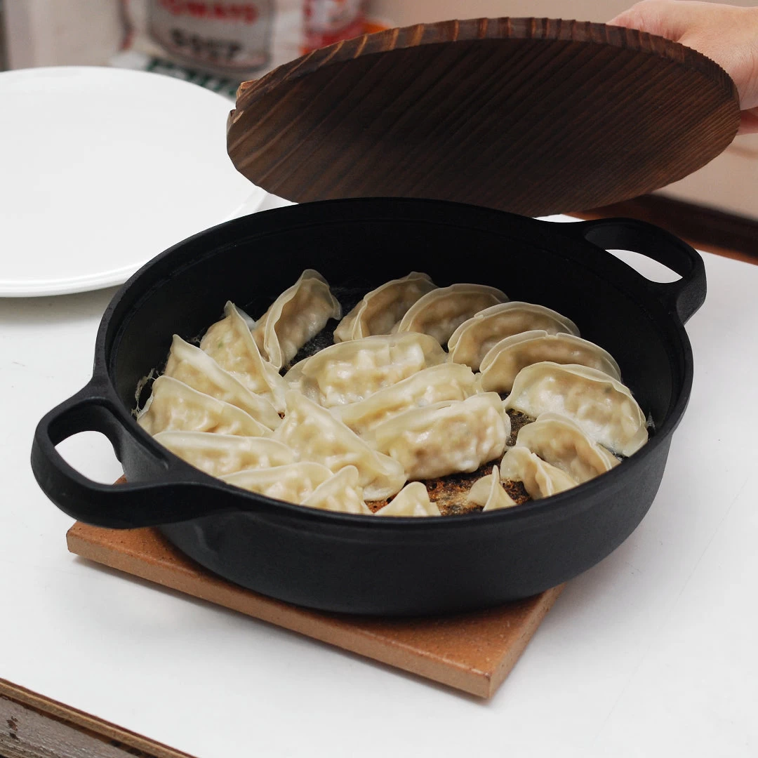 • This pan is ideal either for gyoza or sukiyaki. The wooden lid perfectly fits the pan to prevent the inside ingredients boiling over. You can make crispy but also juicy gyoza.