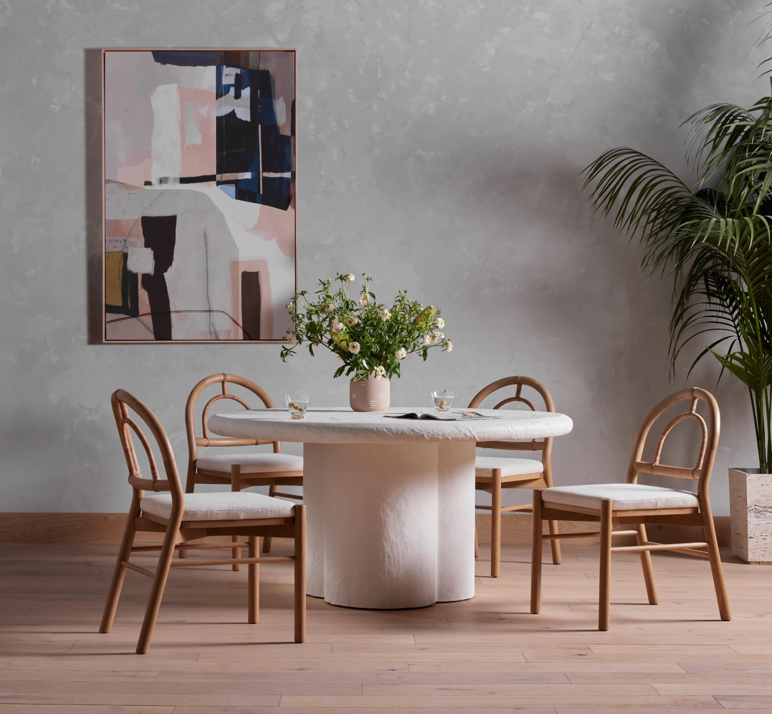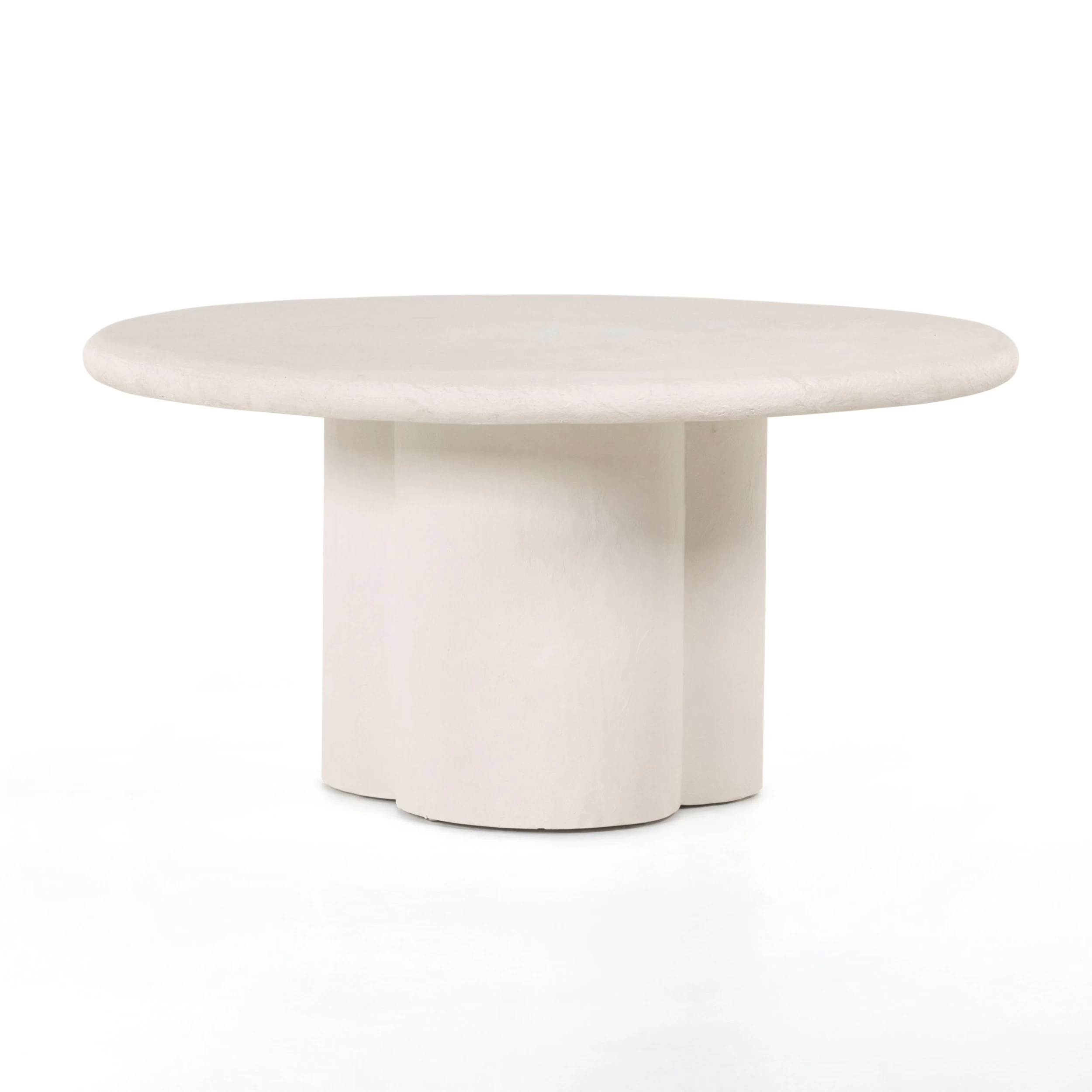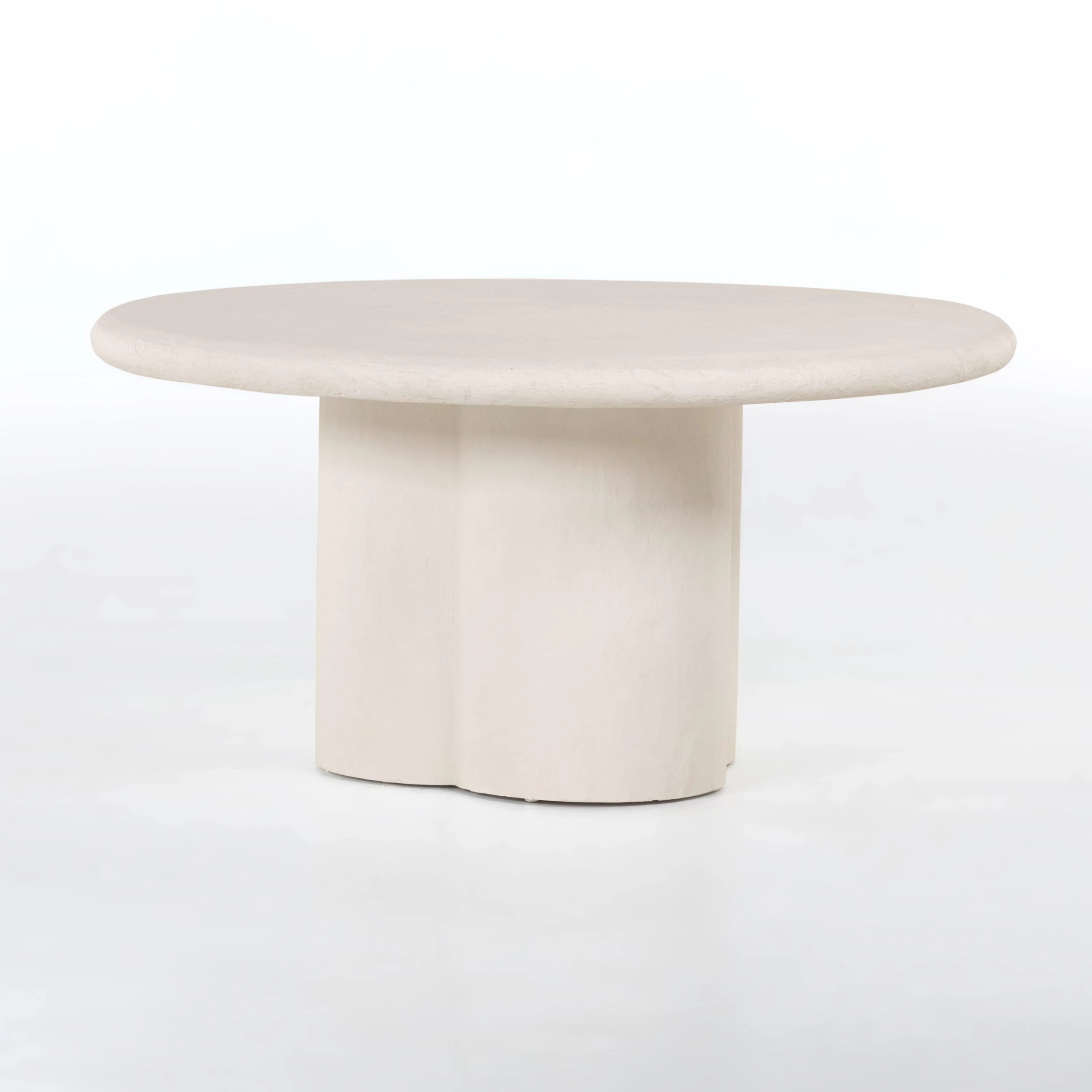 Crisp, clean adobe vibes. Made from white-finished concrete, a voluminous clover-shaped base supports a thick-rounded tabletop for dramatic scale. Soft yet textured look pairs with a wide range of seating, from natural woods to leather, and more.