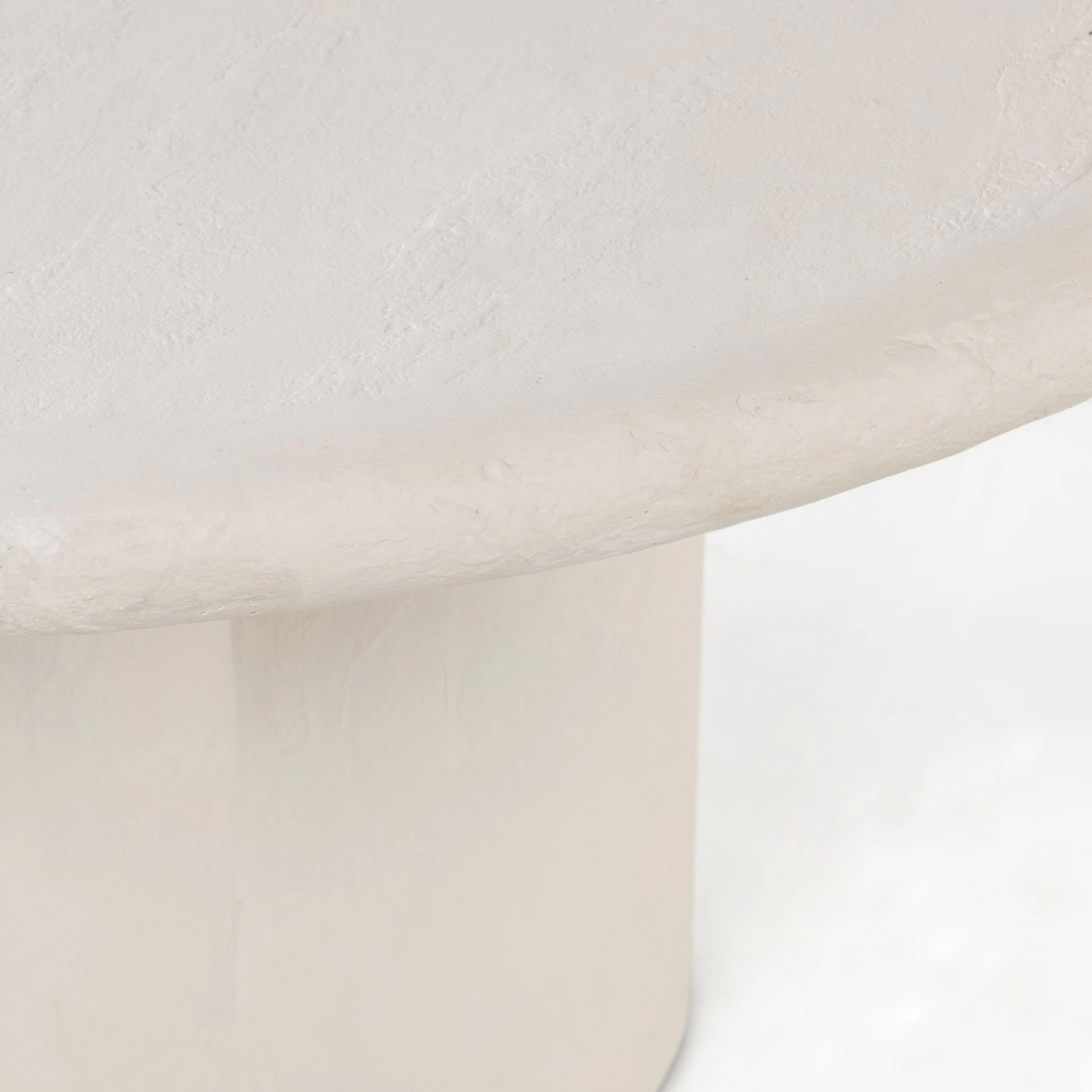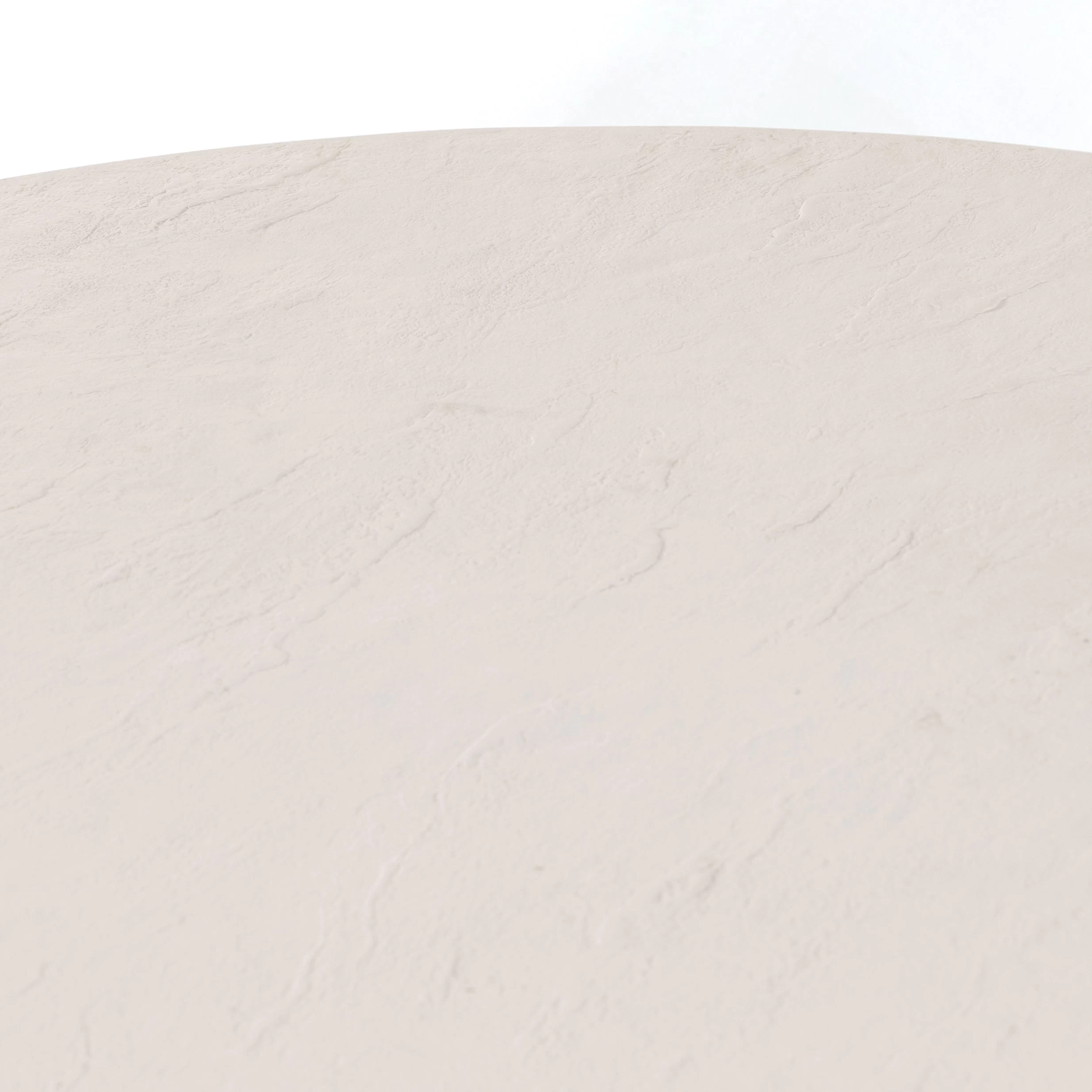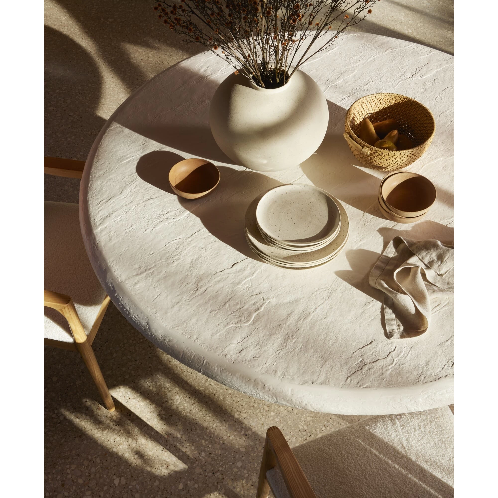 Crisp, clean adobe vibes. Made from white-finished concrete, a voluminous clover-shaped base supports a thick-rounded tabletop for dramatic scale. Soft yet textured look pairs with a wide range of seating, from natural woods to leather, and more.