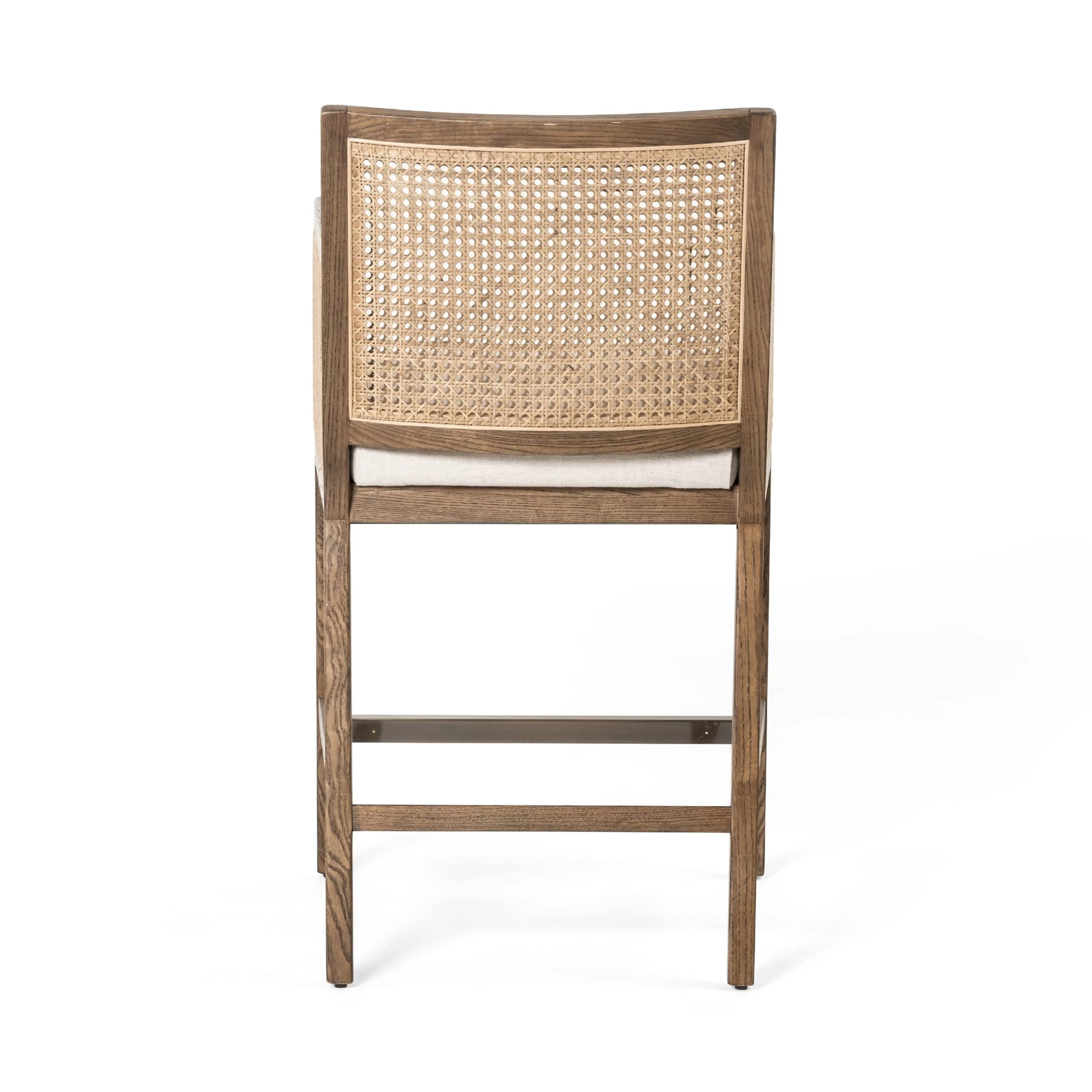 Mixed materials refresh retro counter seating. Light-toasted nettlewood frames a textural inlay of natural cane for a clean, monochromatic look, with a light, linen-blend seat of high-performance fabric for modern sensibility. Performance fabrics are specially created to withstand spills, stains, high traffic and wear, ensuring long-term comfort and unmatched durability.
