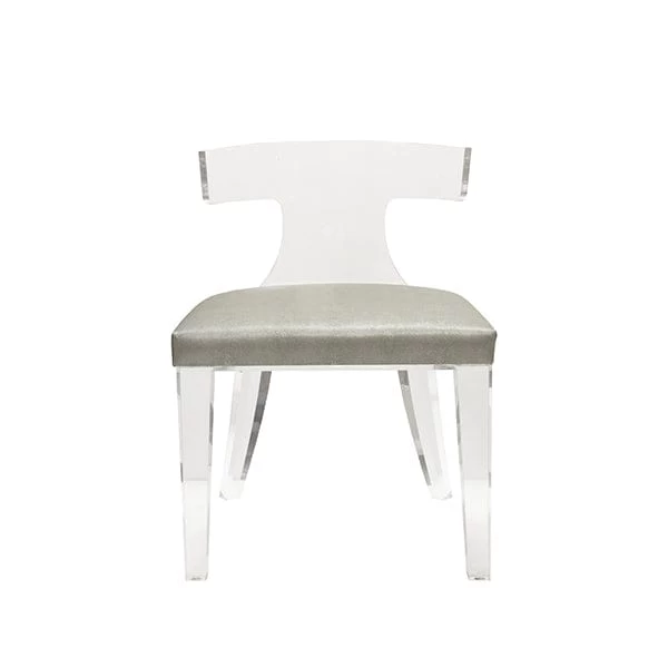 The curved back and tapered legs of our Duke chair are inspired by one of the world’s oldest and most beloved silhouettes. Our take on the classic Greek Klismos chair features a shaped acrylic base paired with an upholstered seat in dove grey faux shagreen.