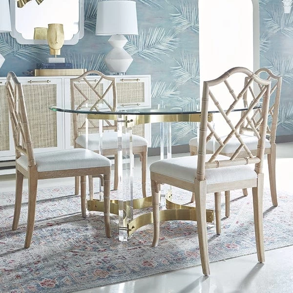 The joyous curvature of our Hendrix table base will have you sending out the invites for dinner parties every weekend! Rigid acrylic legs are joined by arching, antique brass stretchers to create a look that is both light and luminous.